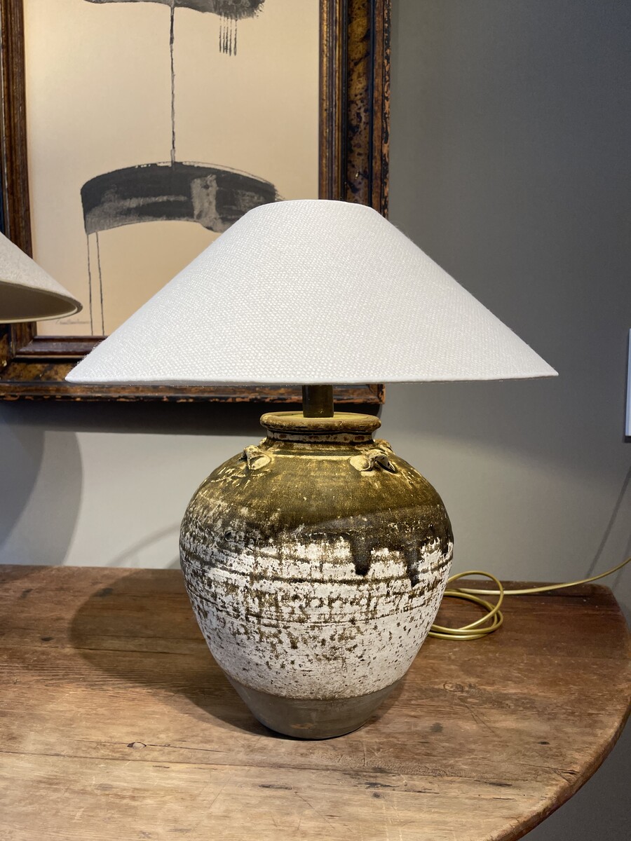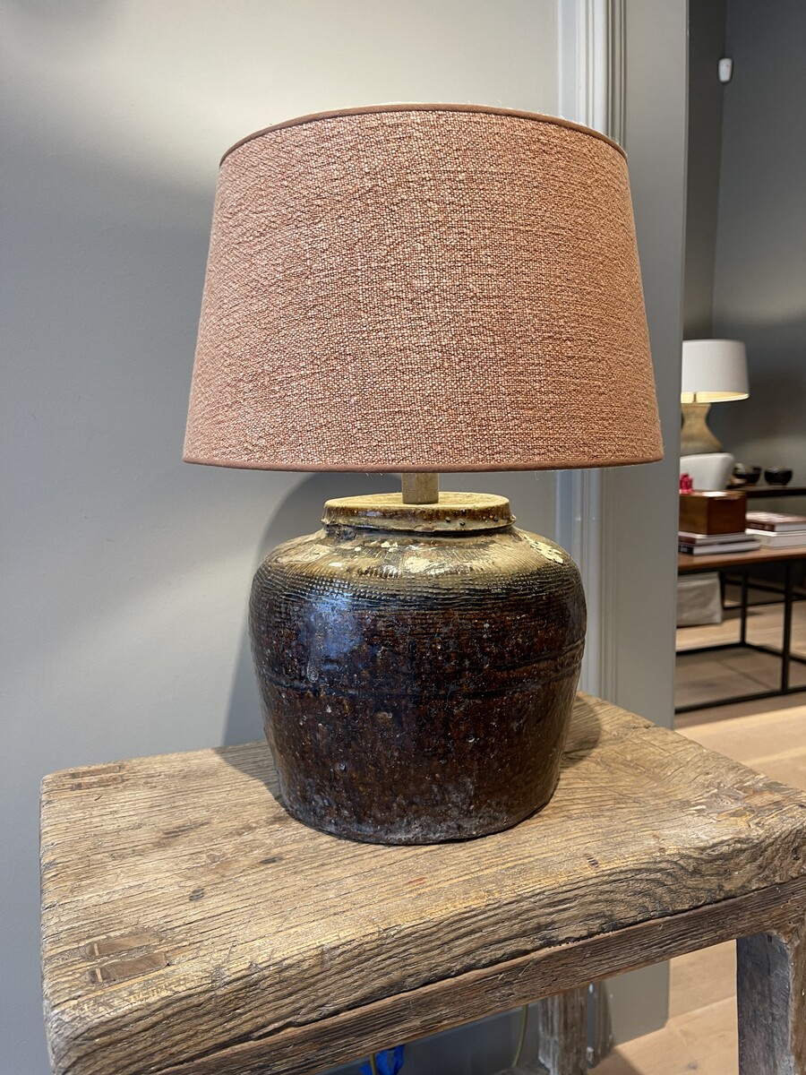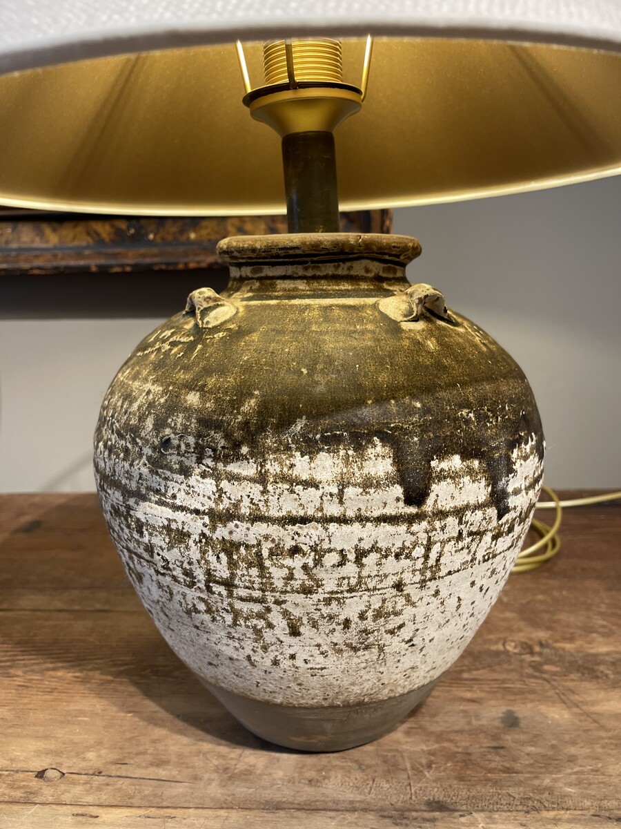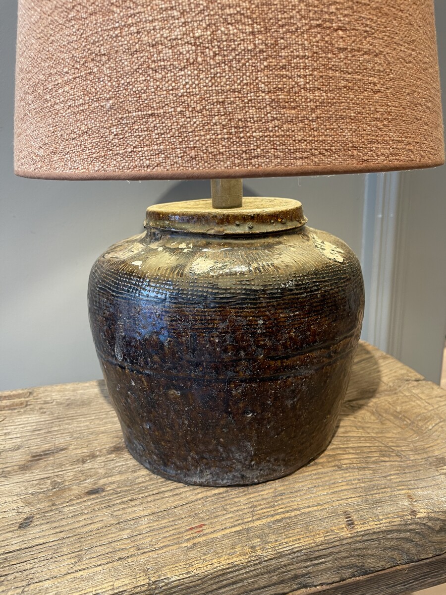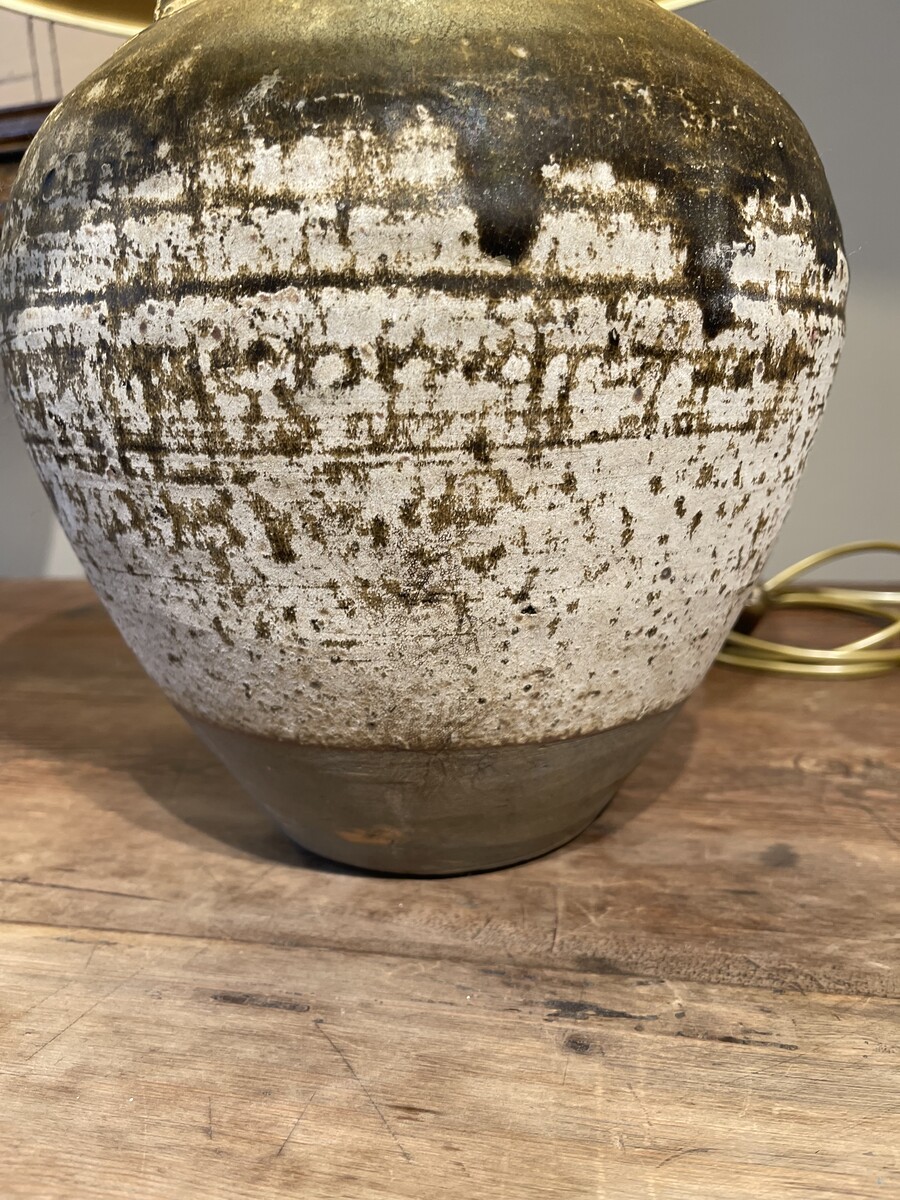 große Reistopf-Lampe mit oliv-brauner Glasur